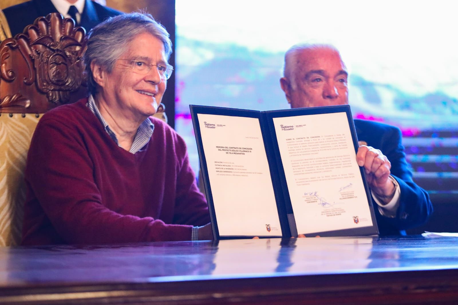 Por su parte, el representante de VillonacoEnergy S.A., Eduardo Mora, afirmó que la firma de este contrato es un hito que se cumple gracias al apoyo del Gobierno del Ecuador y del Presidente Lasso: “El proyecto eólico Villonaco III tiene como objetivo principal aumentar la generación de eléctrica renovable al país, contribuyendo a la diversificación de la matriz energética y reduciendo nuestra dependencia de los combustibles fósiles”.