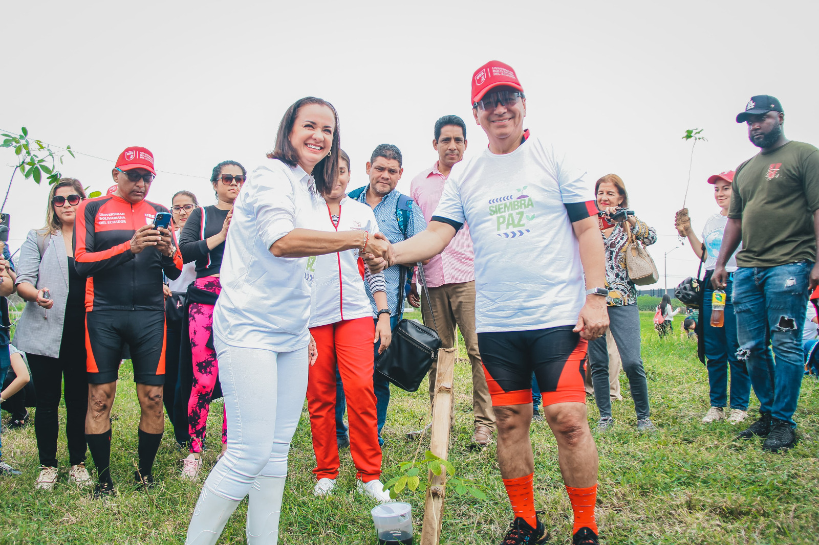La prefecta Marcela Aguiñaga lideró la siembra en el cantón Durán, bajo el lema “Siembra Paz”. En el redondel del distribuidor de tráfico de la vía Durán-Yaguachi, se unió a voluntarios de la Universidad Bolivariana del Ecuador, Instituto Tecnológico Bolivariano, grupos ecológicos y voluntarios para sembrar 500 plantas que, como un elemento innovador, no estaban contenidas en fundas plásticas sino en un envoltorio biodegradable.