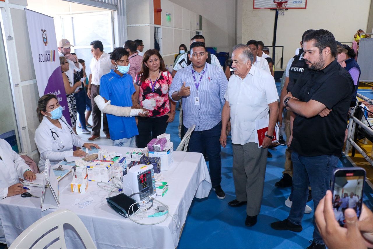Posteriormente visitaron los albergues habilitados en el Coliseo Gran Cacique de Playas, donde constataron las condiciones de vida de 160 personas, alrededor de 45 familias, que incluye 69 niños, 8 personas con discapacidad, 2 embarazadas, 9 adolescentes y 63 adultos, mismas que reciben 3 comidas diarias, atención médica, medicinas, vacunación, terapias sicológicas, recreacionales para niños y adultos, vestimenta, kits de aseo personal, todo a cargo de los ministerios de Salud y Mies ministerios con coordinación gubernamental.