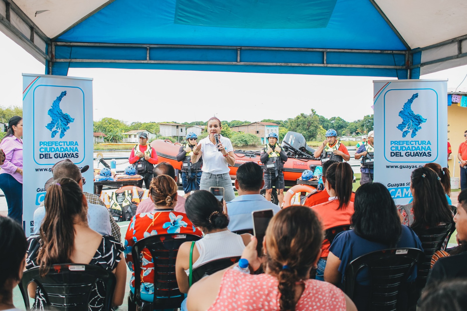 Luego, la prefecta Aguiñaga se trasladó hasta el cantón Salitre. Navegando un breve tramo del río Vinces, llegó el malecón de La Bocana, a bordo de la tercera lancha para salvamento acuático que donó al Cuerpo de Bomberos de la localidad, con su respectivo motor fuera de borda y equipamiento para salvamento acuático.