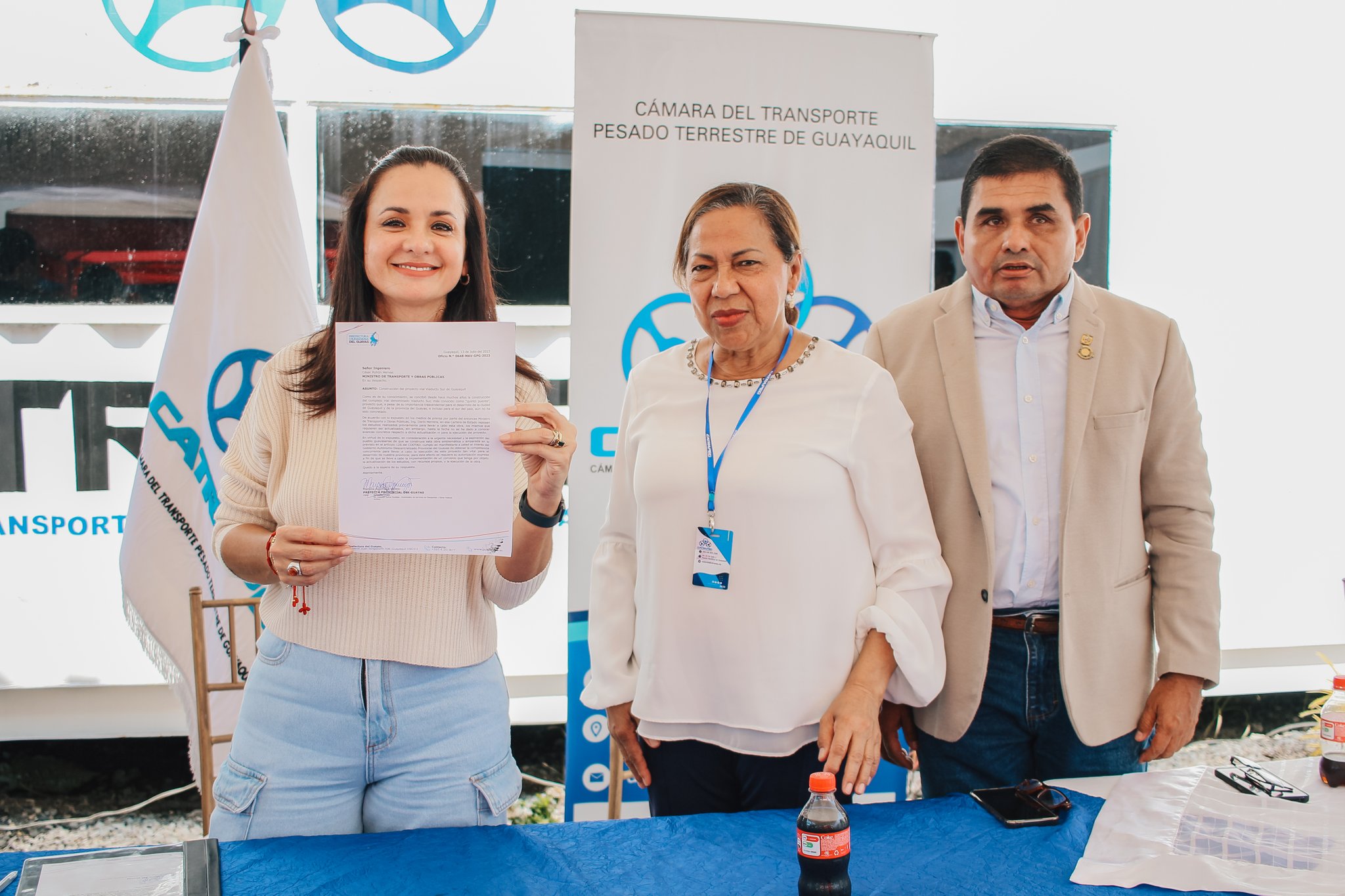 Guayaquil.- Miembros de la Cámara de Transporte Pesado Terrestre de Guayaquil (Catrapeg) fueron los testigos de honor de la firma por parte de la prefecta del Guayas, Marcela Aguiñaga, del pedido al Ministerio de Transporte y Obras Públicas (MTOP) para que se le autorice a la Prefectura Ciudadana actualizar los estudios para el Quinto Puente.
