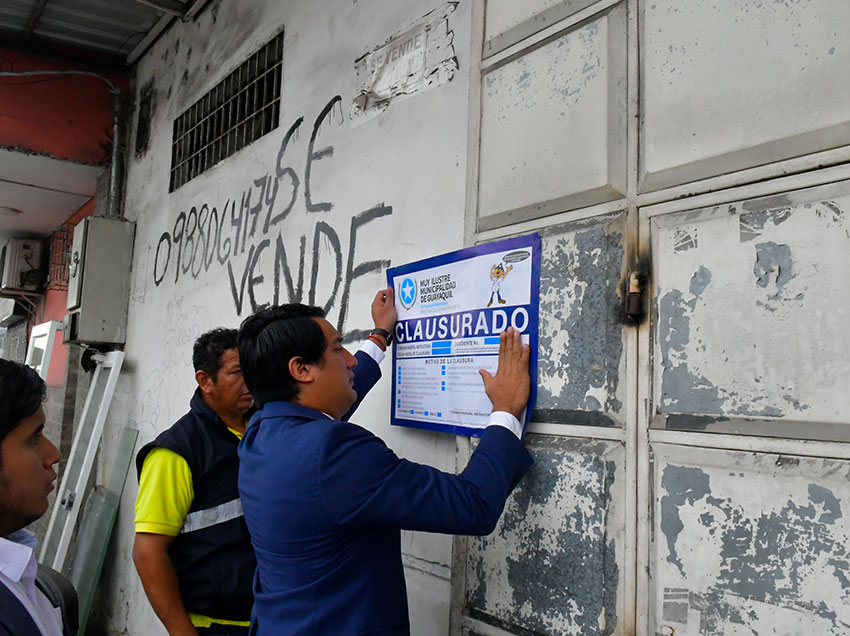 Guayaquil.- Un local ubicado en las calles Alcedo y José Mascote y un puesto de venta de cárnicos, situado en la ciudadela Sauces 3, fueron clausurados por personal de la Dirección de Justicia y Vigilancia, por no contar con los permisos habilitantes y por funcionar en condiciones insalubres.