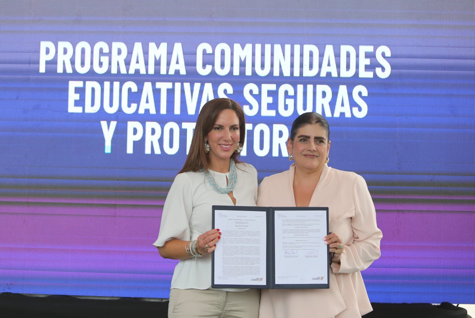 Guayaquil.- La ministra del Interior, Mónica Palencia, y la ministra de Educación, Alegría Crespo, firmaron el Convenio para la implementación del Programa Comunidades Educativas Seguras y Protectoras, que contó con la presencia del presidente Daniel Noboa Azín, durante la inauguración del Régimen Escolar Costa – Galápagos 2024 – 2025, en la Unidad Educativa Fiscal Los Vergeles. El Ministerio del Interior, Ministerio de Educación y Policía Nacional implementarán esta iniciativa en 365 unidades educativas priorizadas, ubicadas en 23 provincias del Ecuador continental.