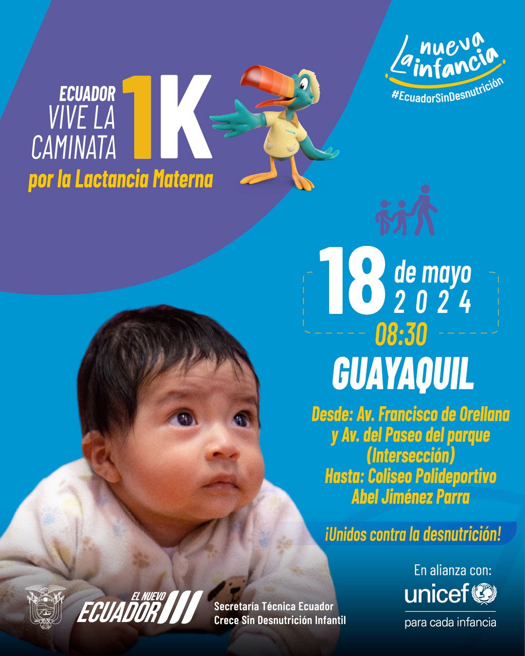 Guayaquil.- El próximo 18 de mayo, de manera simultánea, en nueve ciudades del Ecuador se realizará la “Caminata por la Lactancia Materna: Unidos Contra la Desnutrición”, actividad que promueve la protección de la lactancia materna en niños menores de seis meses y así prevenir la desnutrición crónica infantil.