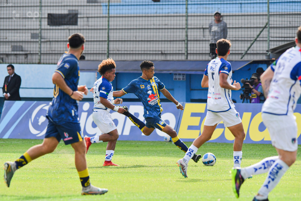 Luca Klimowich ingresa al área manabita pero es bien contenido por los zagueros centrales del Delfín.