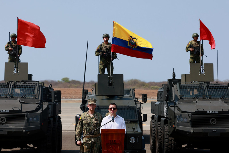 El presidente Daniel Noboa Azin acompañó al acto simbólico en el que señaló que, “estos vehículos blindados con equipamiento especial son para fortalecer sus operaciones, para cuidar nuestra soberanía y proteger nuestro futuro”.