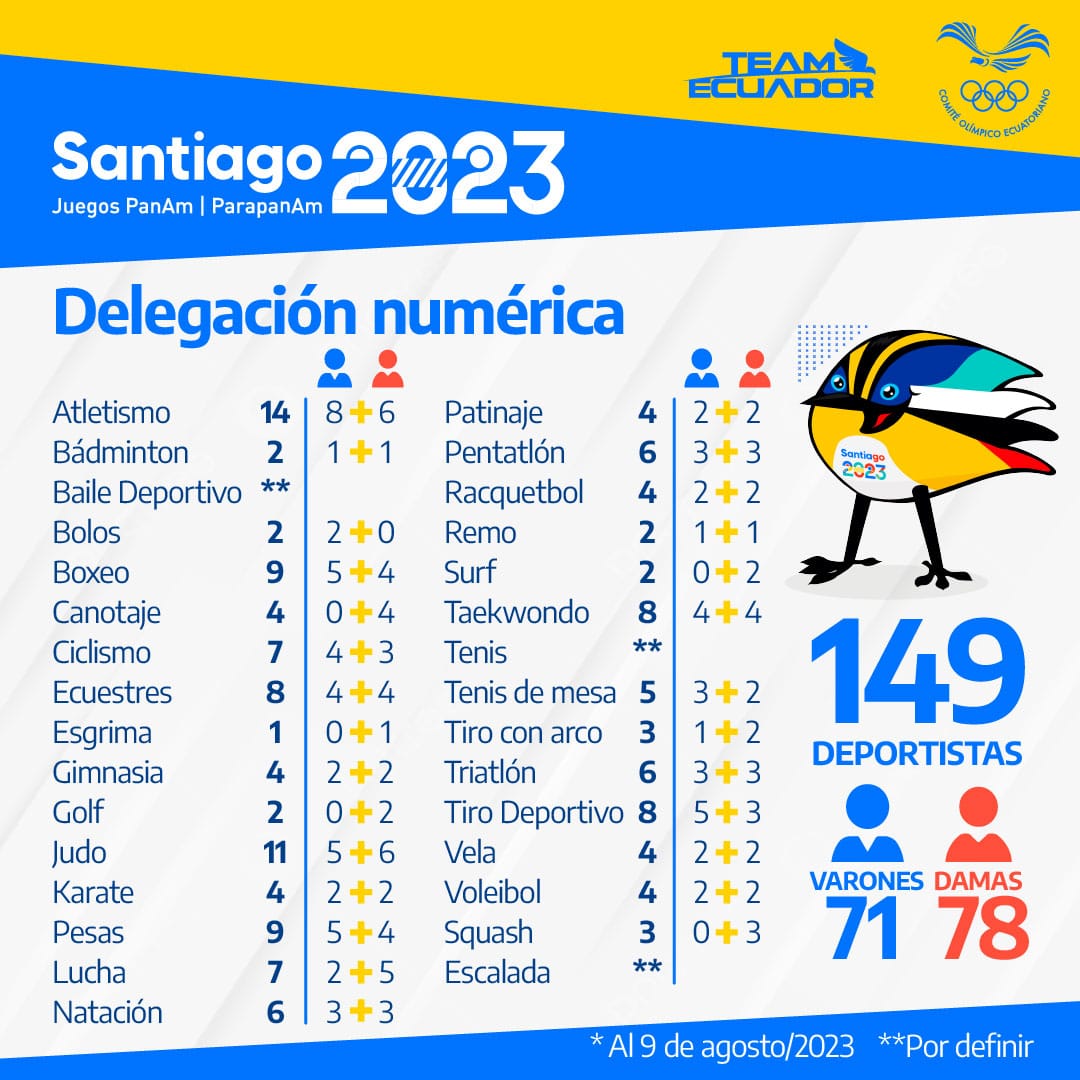 Guayaquil.- Cuando restan 72 días para que inicien los XIX Juegos Panamericanos Santiago 2023 y aún está abierto el proceso de clasificación para algunas disciplinas, el Team Ecuador ya cuenta con el 83 % de las cuotas proyectadas.