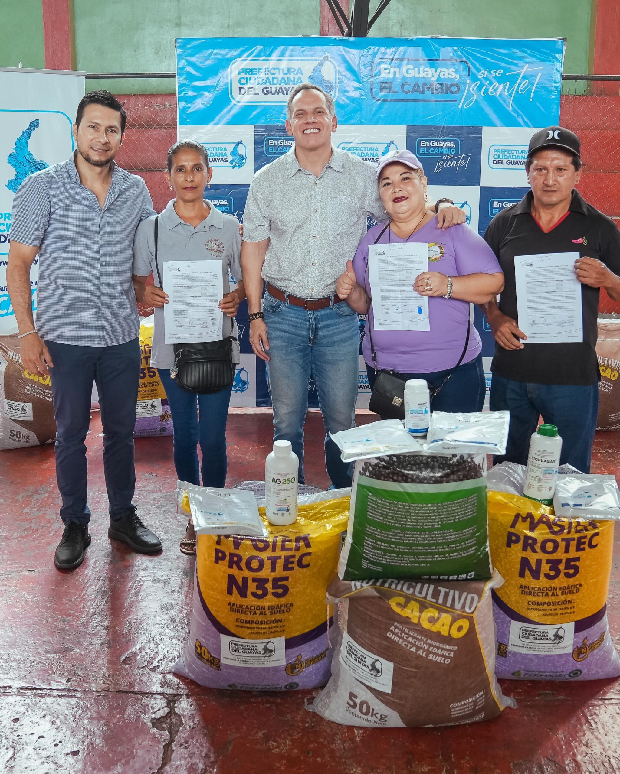 Naranjo.- En el coliseo municipal Abraham Bedrán, el viceprefecto Carlos Serrano lideró la entrega de fertilizantes para el cultivo de cacao a 400 pequeños productores de Naranjito.