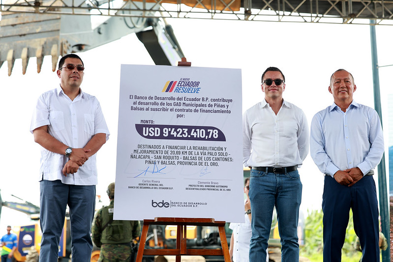 Con el financiamiento del Banco de Desarrollo del Ecuador los recursos se distribuirán de la siguiente manera: USD 9,4 millones se destinarán para mejorar 20,69 kilómetros que conectan los cantones Piñas y Balsas, lo que beneficiará a la movilidad de 38.000 habitantes. USD 15,2 millones permitirán los trabajos de 9 kilómetros de la vía Pajonal, de este monto, el primer desembolso gestionado hoy es de USD 6,1 millones. Los fondos mejorarán el transporte de la producción agrícola de los sectores aledaños al tramo.