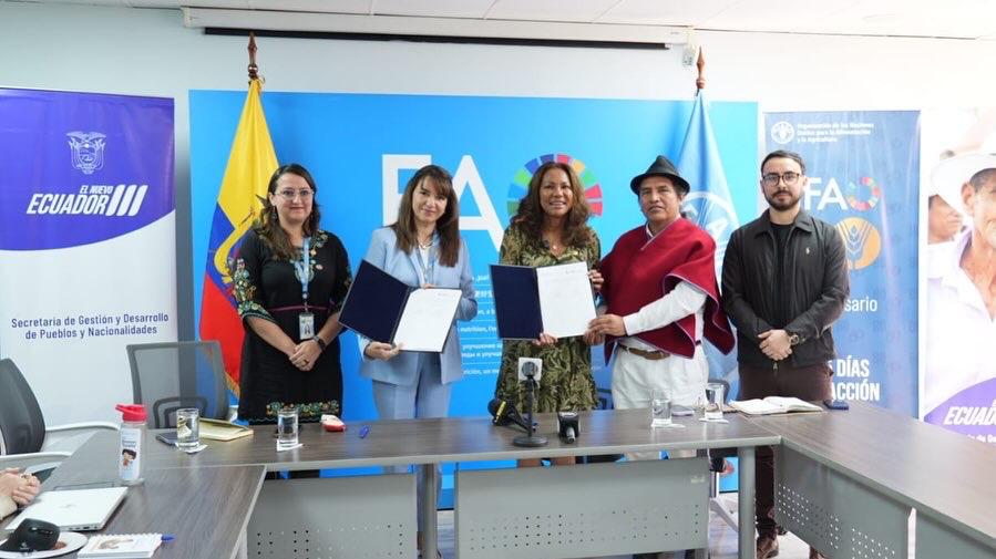 Quito.- Con el objetivo de promover el desarrollo integral y la sostenibilidad de los Pueblos y Nacionalidades Indígenas, Afroecuatorianos y Montubios del Ecuador, la Secretaría de Gestión y Desarrollo de Pueblos y Nacionalidades (SGDPN) firmó una alianza de cooperación estratégica con la Organización de las Naciones Unidas para la Alimentación y la Agricultura (FAO), la cual apunta al fortalecimiento de las economías productivas que contribuyan a la transformación de los sistemas agroalimentarios y la transición hacia dietas saludables y al cumplimiento de los Objetivos de Desarrollo Sostenible (ODS), en el marco de la Agenda 2030.