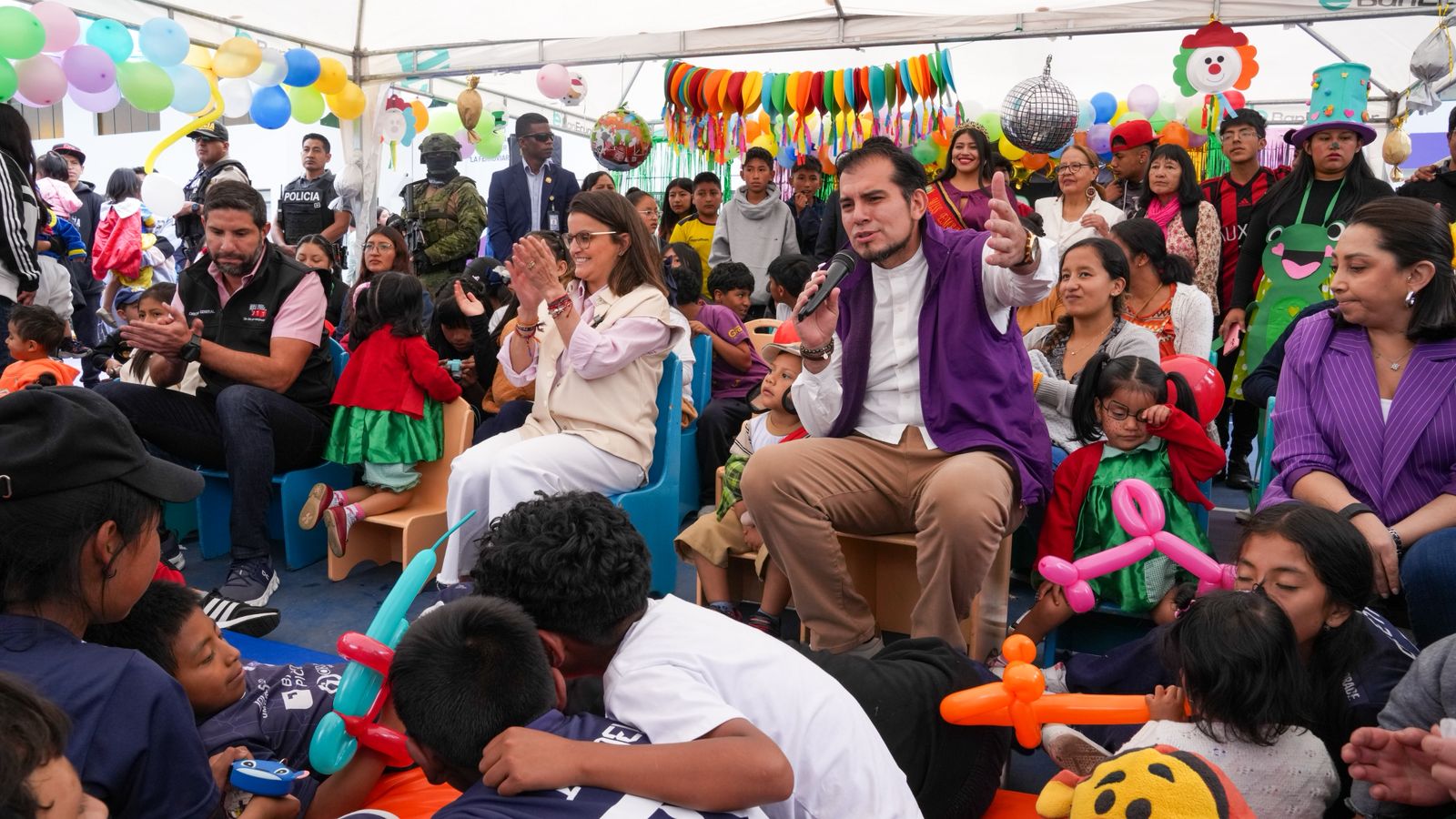La jornada, que se hizo en el marco de la conmemoración del Día del Niño, contó con la participación de la vicepresidenta de la República, María José Pinto, el ministro de Inclusión Económica y Social, Harold Burbano, y autoridades del ECU 911 y la Unidad de Registro Social, quienes compartieron junto a las niñas y niños de las actividades lúdicas y presentaciones artísticas que se llevaron a cabo.