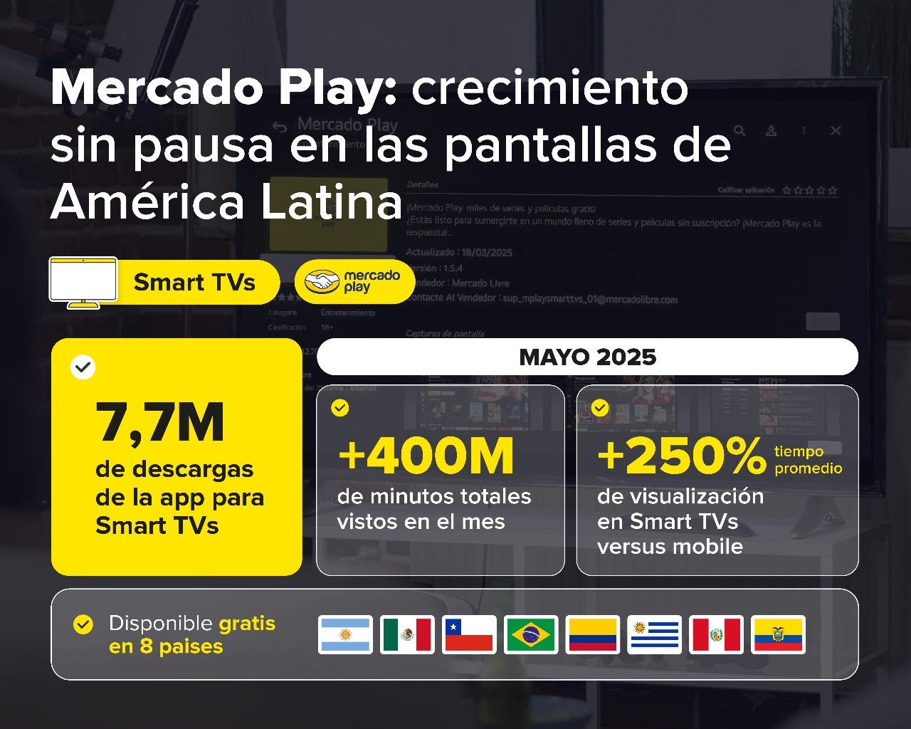 Quito.- A tan solo 3 meses de su lanzamiento, la app para Smart TVs de Mercado Play superó las 7,7 millones de descargas a nivel regional, con Brasil, México y Argentina a la cabeza. Esto marca un nuevo hito en su consolidación como una de las plataformas de streaming gratuito más elegidas en América Latina.