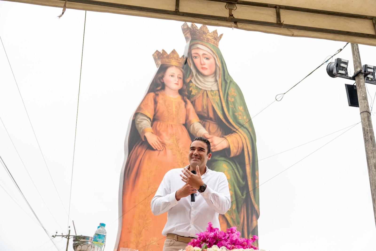 La imagen que preside el mirador es réplica de la estatua de Santa Ana, patrona del cantón, junto a la Virgen María y fue donada en 1901 a la iglesia de Samborondón. Simbolizan la profunda tradición católica y el patrimonio cultural de la comunidad. La bendición del mirador, se realizó al cierre de las recientes fiestas patronales, reafirmando el compromiso del alcalde Juan José Yúnez con la conservación de las manifestaciones religiosas locales y la cultura propia del cantón.