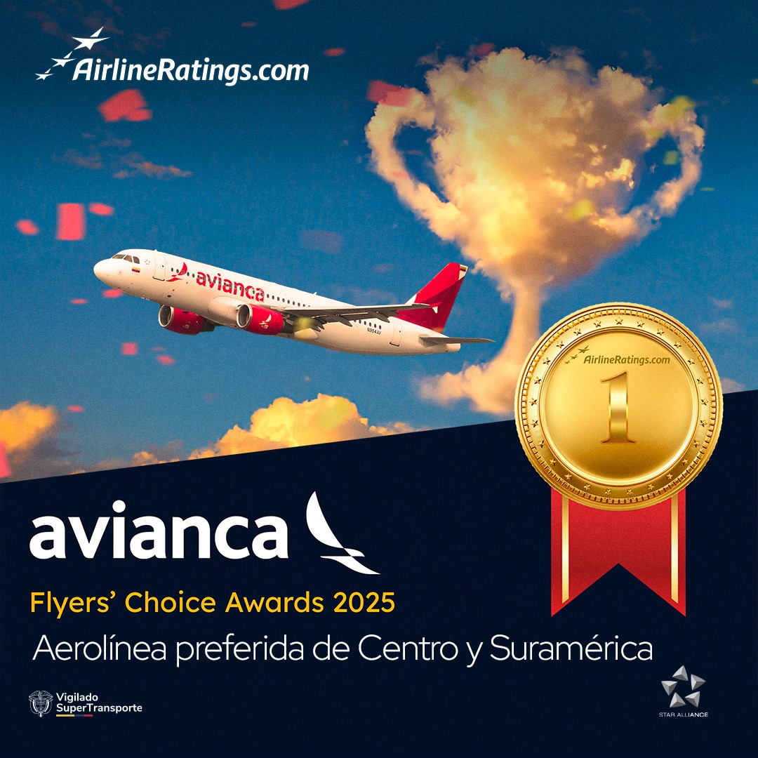 Bogotá.- Avianca fue reconocida como la aerolínea preferida de Centro y Suramérica en los Flyers’ Choice Awards 2025, una iniciativa global de AirlineRatings.com, sitio líder en calificaciones de seguridad y producto en la industria aérea a nivel mundial. A diferencia de otros premios técnicos, estos galardones se basan únicamente en la votación de viajeros de todo el mundo, quienes eligieron sus aerolíneas favoritas por región.