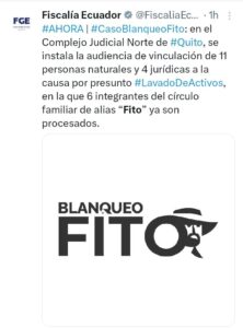 Este causa por lavado de activos, que sigue la Fiscalía en Ecuador, es distinta, y seis integrantes del círculo familiar de Fito ya fueron procesados, e incluso mantienen prisión preventiva.