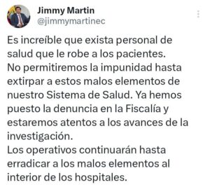 El viceministro de Salud, Jimmy Martin, publicó en sus redes sociales: «Es increíble que exista personal de salud que le robe a los pacientes. No permitiremos la impunidad hasta extirpar a estos malos elementos de nuestro Sistema de Salud. Ya hemos puesto la denuncia en la Fiscalía y estaremos atentos a los avances de la investigación.