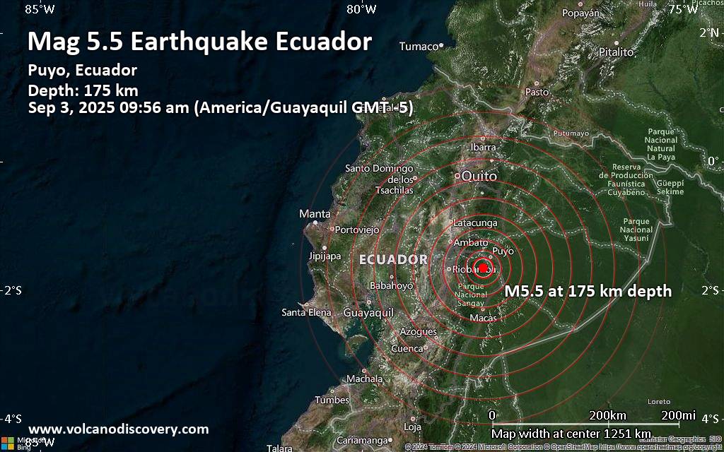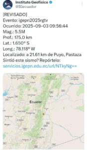 Puyo.- Un fuerte temblor de magnitud 5,5 en la escala de Richter se registró la mañana del miércoles 3 de septiembre de 2025 en el sur de Ecuador, afectando varias ciudades y provincias del país. Según el Instituto Geofísico del Ecuador, el sismo ocurrió a las 09:56, con epicentro en Puyo, provincia amazónica de Pastaza, y una profundidad de 175 kilómetros.