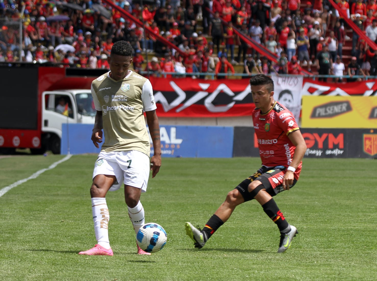 Calderón y Plúas son quienes presionan la salida por parte de los volantes morlacos quien tratan de romper la defensiva en medio sector de los bananeros.