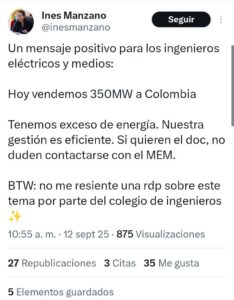 «Un mensaje positivo para los ingenieros eléctricos y medios: Hoy vendemos 350MW a Colombia», señaló la titular de la Cartera de Estado, a través de su cuenta de X.