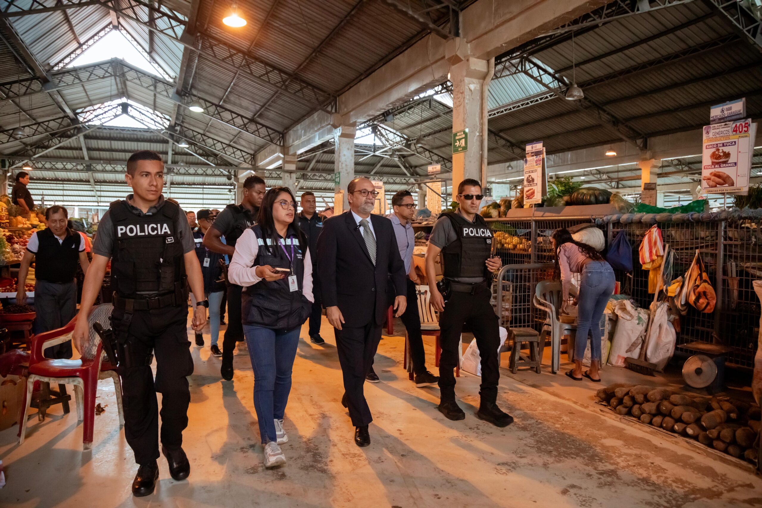 En el mercado municipal La Caraguay, al sur de Guayaquil, el gobernador Humberto Plaza, junto a la intendenta Victoria Villa y comisarios de Policía, supervisaron la venta y el pesaje de productos de primera necesidad para garantizar precios justos y accesibles.