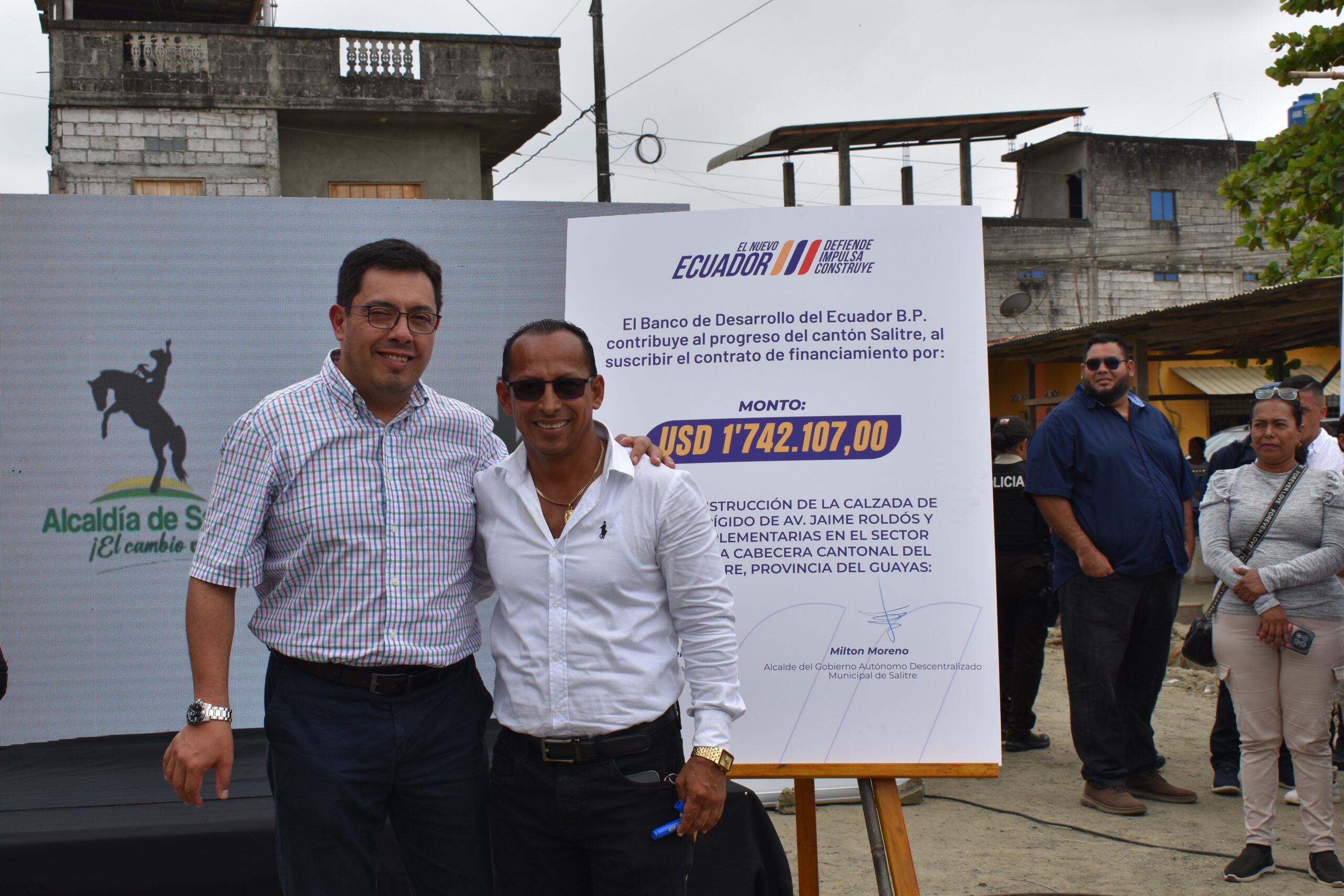 Durante el acto de suscripción, el gerente general del BDE B.P., Carlos Rivera, destacó: “Hoy se hace posible la firma de este contrato por USD 1.7 millones para mejorar la vía Jaime Roldós y empezar el embellecimiento de este barrio y la obra pública de esta hermosa ciudad. El Gobierno del presidente Daniel Noboa, a través del BDE reafirma el compromiso de cambiar la vida de los ecuatorianos y salitreños con obras públicas de calidad. El Ecuador está de pie caminando hacia un mejor futuro para que todas las familias ecuatorianas tengan oportunidad de progresar. Han tenido que pasar décadas para tener esta obra pública y el presidente de la República está comprometido para que los salitreños tengan obras que nunca han tenido”.