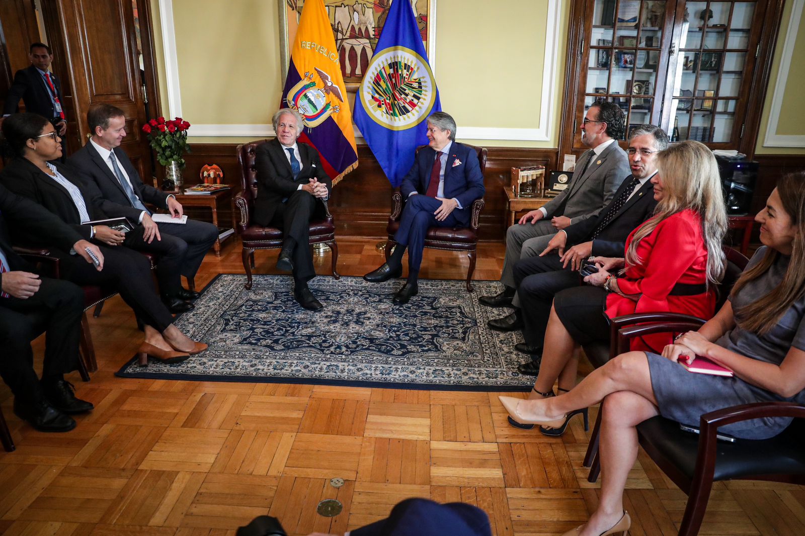 Washington D.C., Estados Unidos. La mañana de este 25 de septiembre, el Presidente de la República, Guillermo Lasso, inició su agenda de trabajo en Washington D.C. con una reunión con Luis Almagro, Secretario General de la Organización de los Estados Americanos (OEA). Durante el encuentro se destacó la intención de fortalecer y mantener una estrecha colaboración con este organismo en asuntos prioritarios como democracia y seguridad.