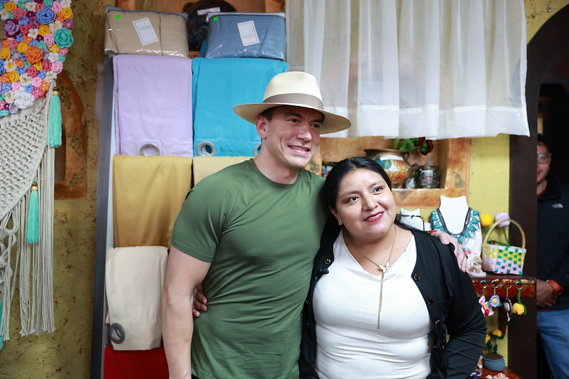 Durante su recorrido por el establecimiento, el mandatario conversó con Jessica Lojano, quien se dedica a la confección de jeans. Jessica es beneficiaria del Bono de Desarrollo Humano (BDH) desde 2020. Sin embargo, comentó: “hace un año adquirí este crédito e invertí en materiales para jeans. Ahora tengo mi propia marca”. Con esos recursos su emprendimiento ha crecido progresivamente, consolidando ventas en mercados y alcanzando mayores ingresos en temporadas clave como diciembre.