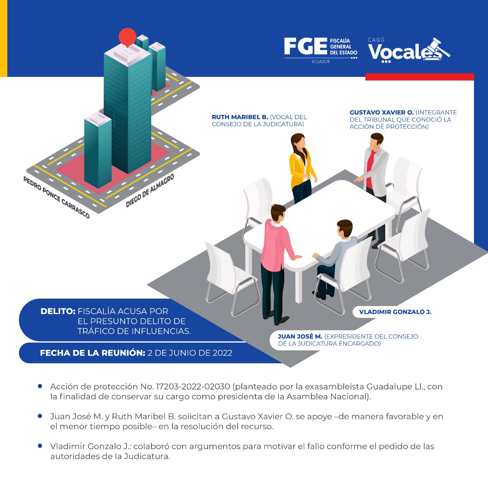La Dra. Diana Salazar, Fiscal General del Estado, señaló a Maribel Barreno y Juan José Morillo (vocales de la Judicatura) como coautores del delito de tráfico de influencias y al juez Vladimir Jhaya como cómplice, quienes prevaliéndose de las facultades de su cargo, ejercieron influencia en Gustavo Xavier O. -juez provincial de Pichincha- para obtener una resolución favorable y célere dentro de la acusación de protección No. 17203-2022-02030, conducta que vulnera la eficiente administración pública.