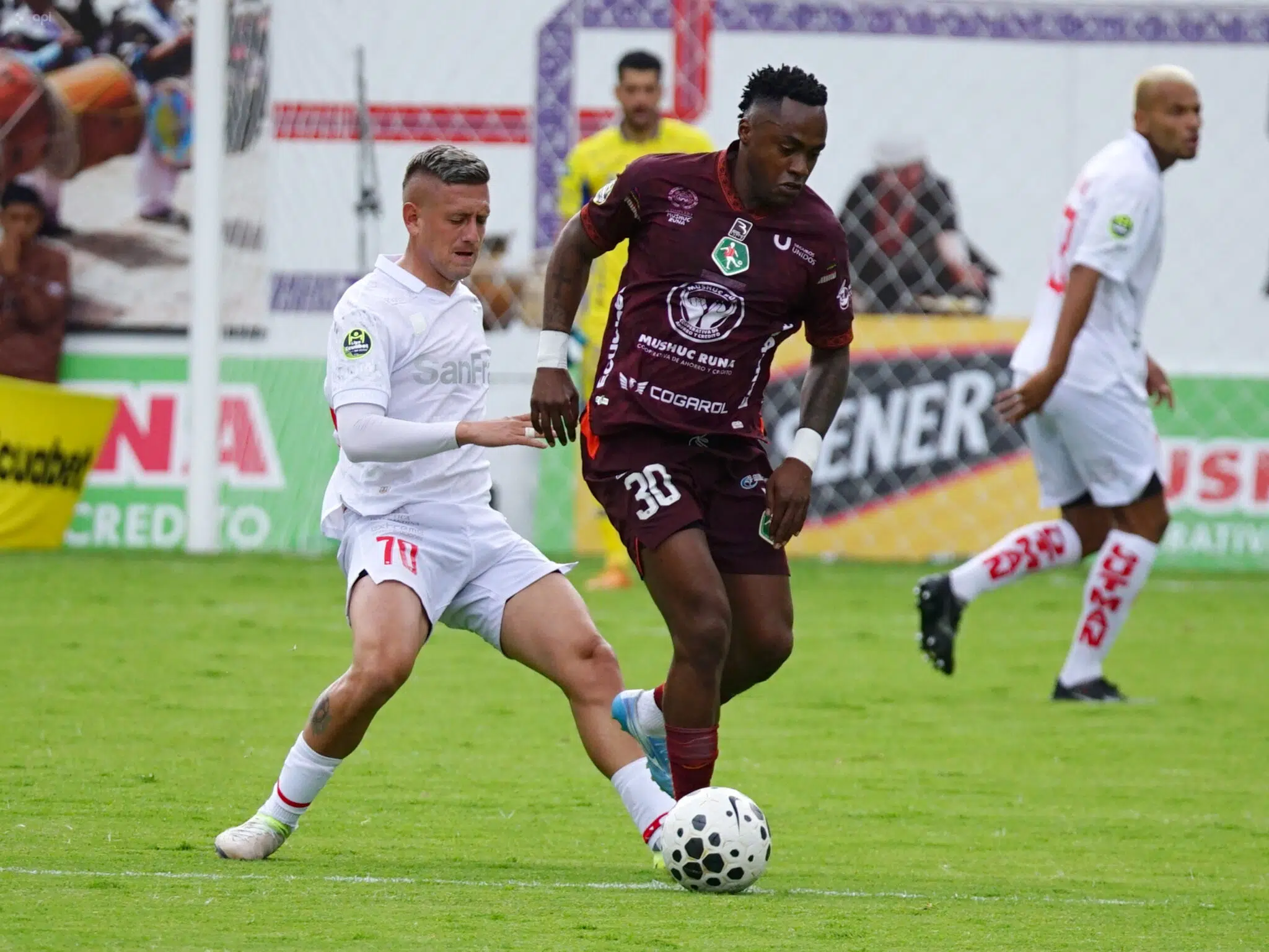 Buena jugada del ponchito, Carlos Orejuela llega por derecha para colocar un centro que es despejado por la defensa de Mushuc Runa para salvar su portería.