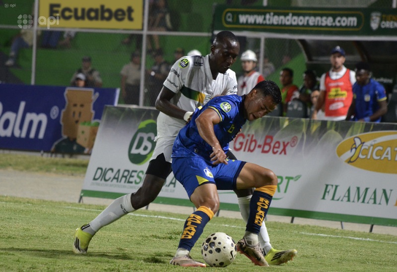 Michael Bermúdez rescata un balón en media cancha y lo acompañaba Ángel Mena pero el volante bananero decide rematar el mismo y se pierde una buena llegada de Orense.