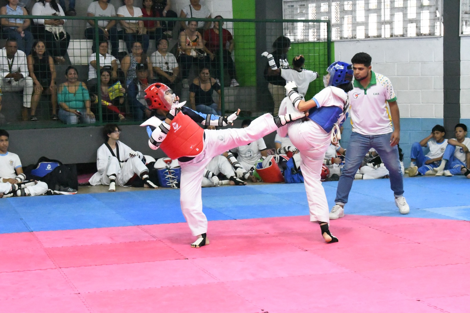 Machala.- En el coliseo y con la implementación de Federación Deportiva de El Oro FEDEORO, se realizan los combates del campeonato intercolegial de taekwondo, evento organizado por Federación Deportiva Estudiantil y la coordinación del departamento técnico metodológico federativo orense.