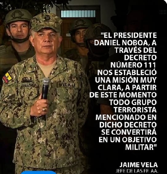 Quito.- Luego del decreto de Conflicto Interno Armado, se reunió el CONSEPE (Consejo de Seguridad Pública y del Estado), y después de varias horas algunas autoridades dieron declaraciones, entre ellas, el Jefe del Comando Conjunto de las Fuerzas Armadas, Almirante Jaime Vela, quien fue enfático en afirmar que:»Todo grupo terrorista identificado en el decreto presidencial, se ha convertido en objetivo militar».